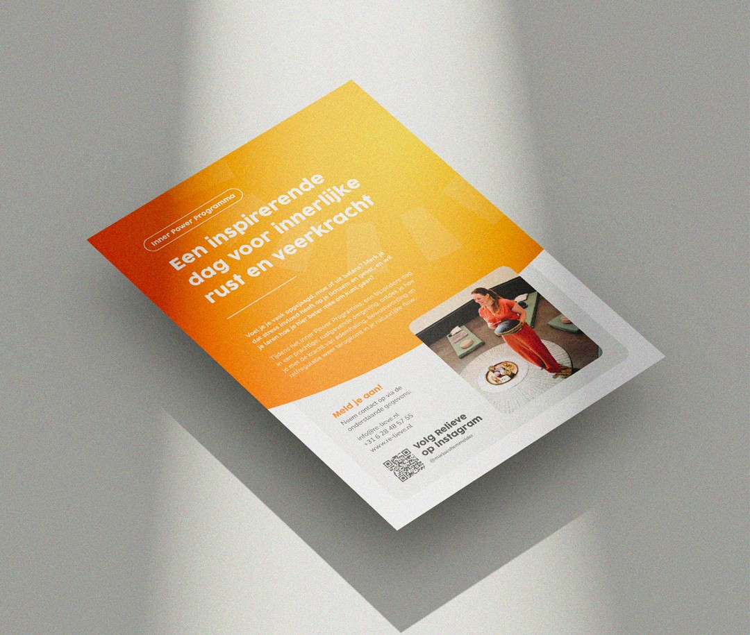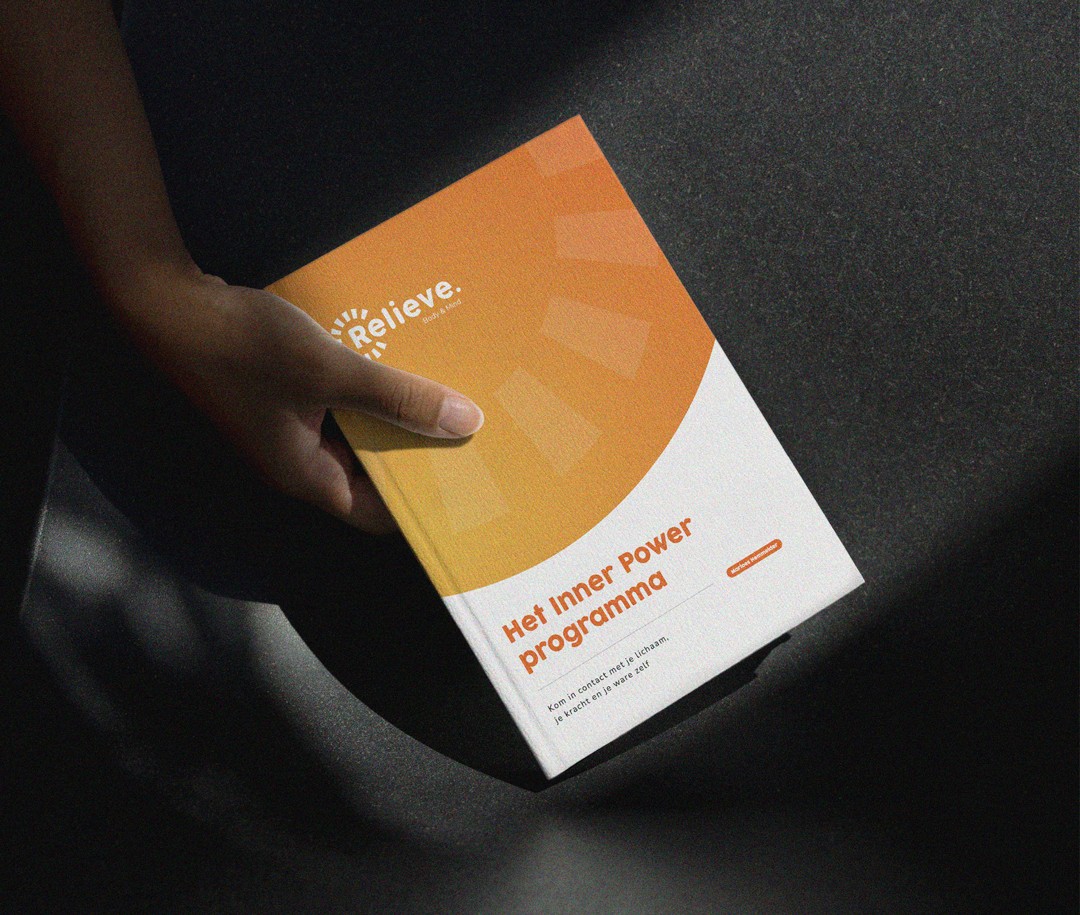 De kern van Relieve draait om vertraging en bewustwording. Die gedachte vormde het uitgangspunt voor de branding. Het logo is ontworpen als een symbolische sleutel naar verbinding met jezelf. De subtiele glow en zonvorm verwijzen naar energie, bewustzijn en groei. Oranje speelt daarin een belangrijke rol: warm, activerend en ondersteunend, zonder dominant te worden.