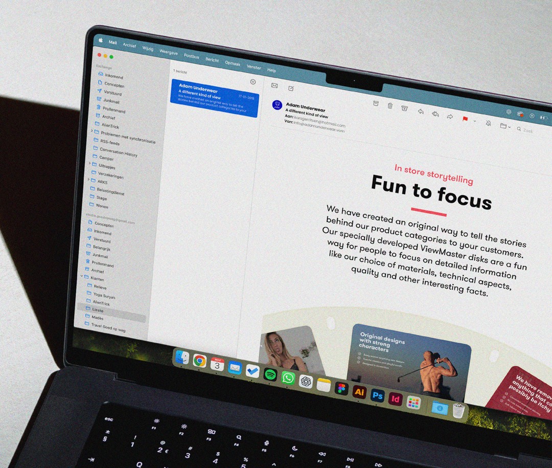 Om nieuwe producten te lanceren werkte ik mee aan campagneconcepten, waaronder Viewmaster. Een nostalgisch object dat perfect aansloot bij de doelgroep en het merkverhaal. Retailers ontvingen een fysieke Viewmaster waarin de collectie en het karakter van A-dam tot leven kwamen.