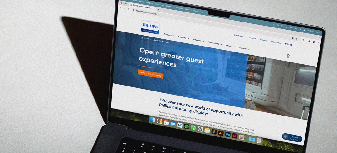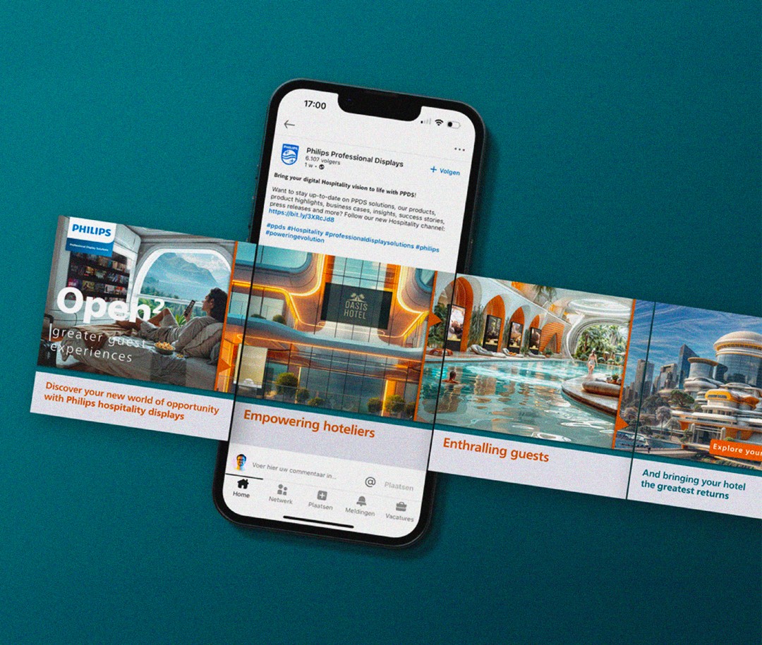 Tijdens mijn periode bij AlienTrick werkte ik aan een online campagne voor Philips Hospitality Displays van PPDS. De vraag was niet om een product uit te leggen, maar om een beleving te laten zien. Hoe voelen de displays binnen een hotelcontext, van lobby tot hotelkamer, restaurant en fitnessruimte?